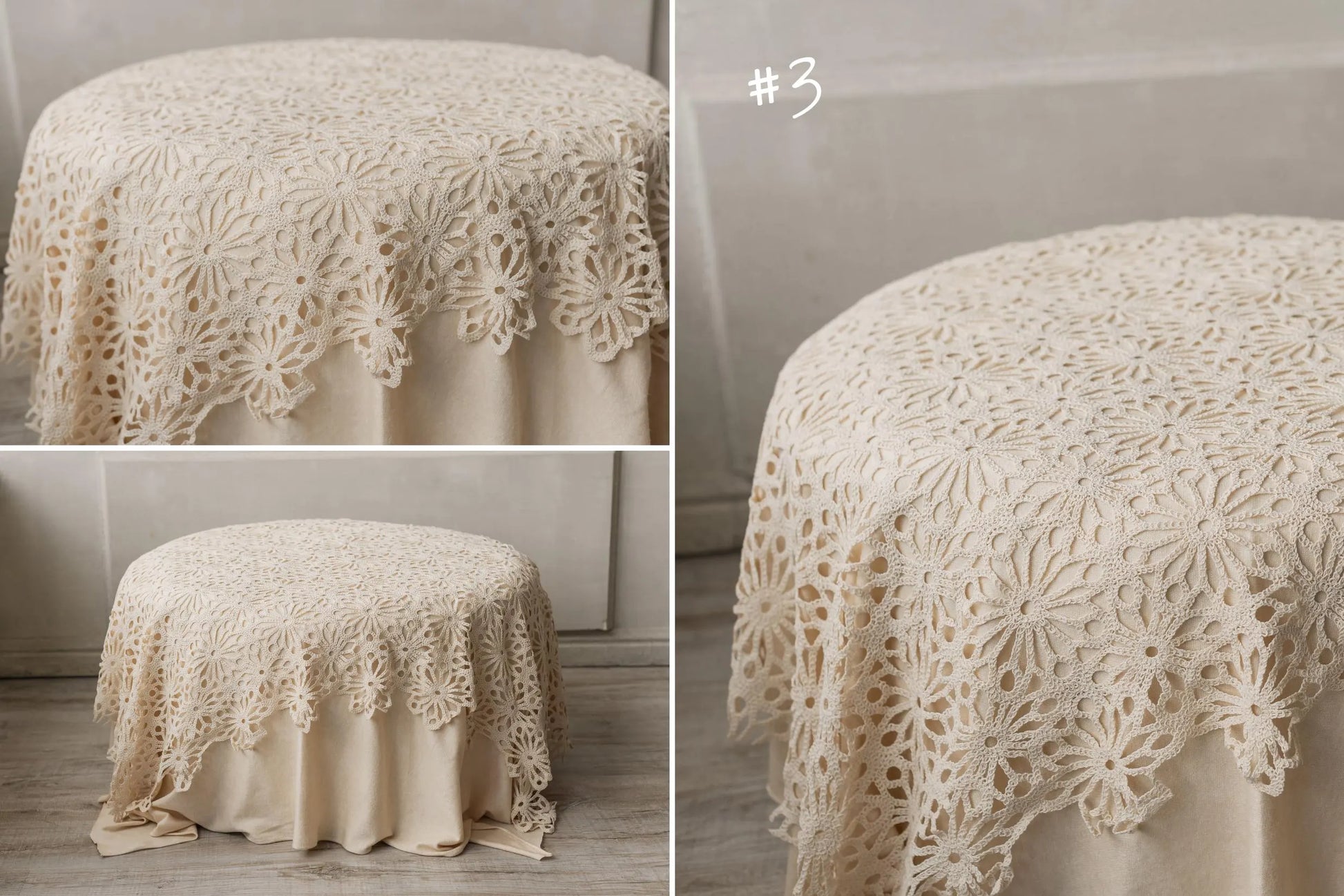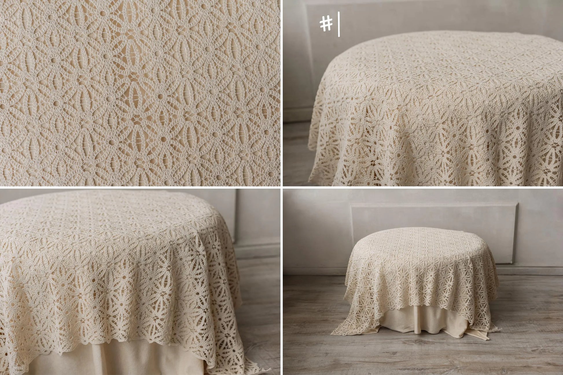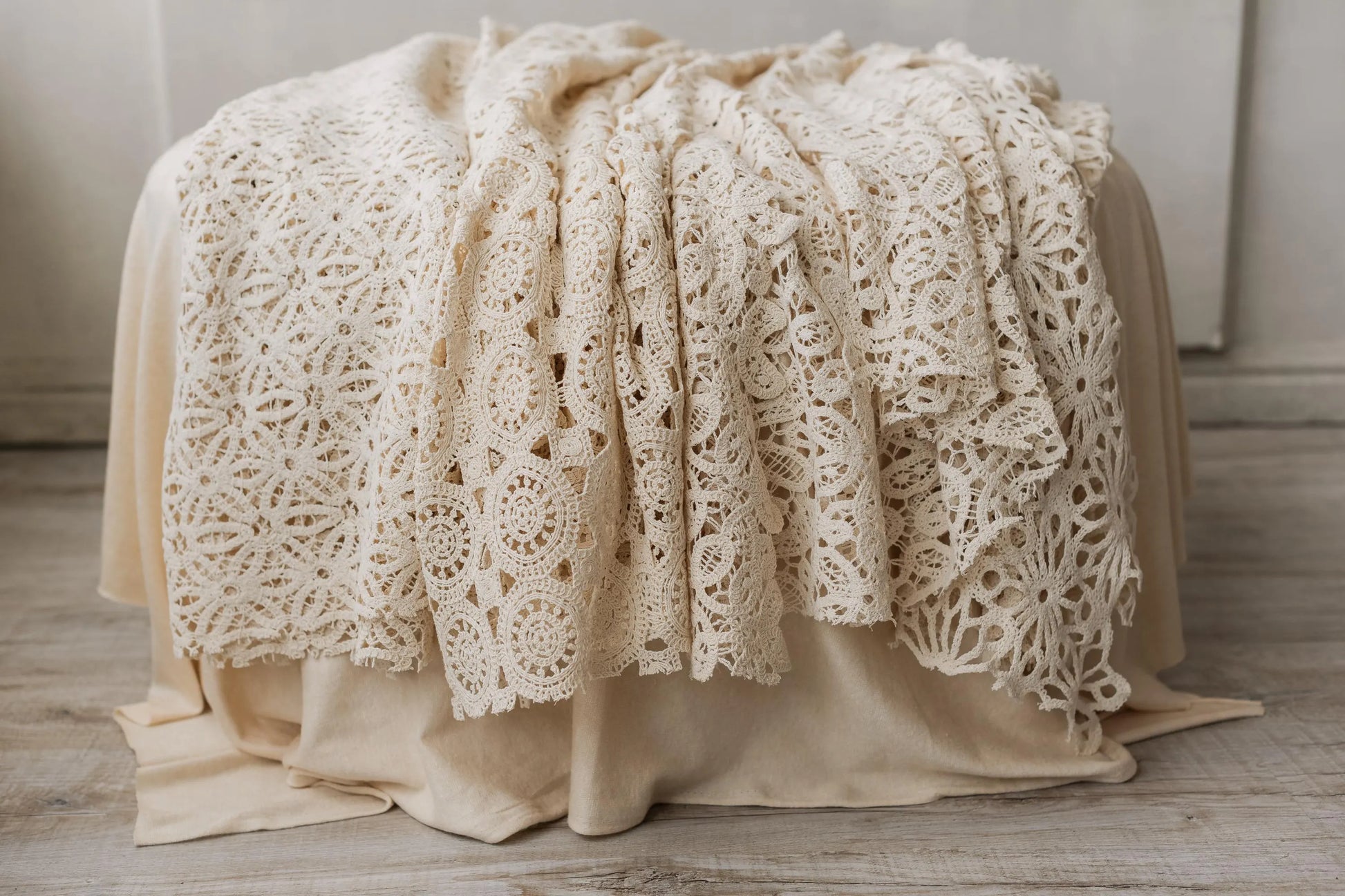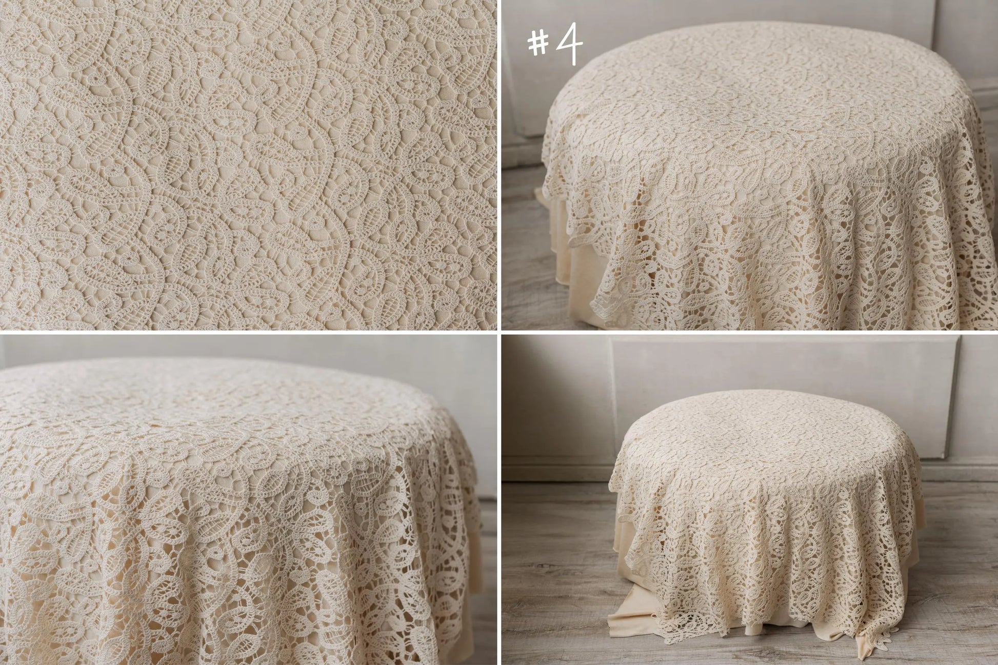 繊細でエレガントなナチュラルカラーのレース生地は、ビーンバッグを使用した撮影にもマッチします。
