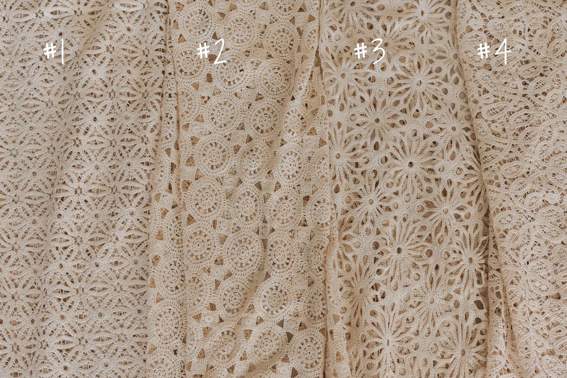 薄手のベージュ生地に本レース生地を重ねて使用することで、理想的な背景の一部となります。