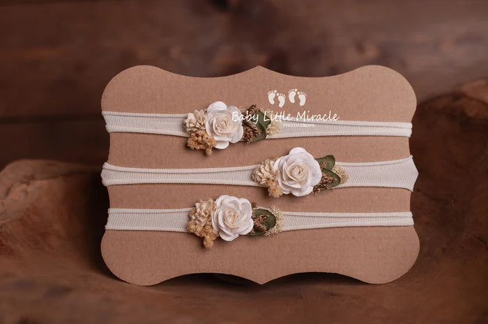 ローズやラブリーフラワーをイメージしたヘッドバンドです。伸縮性のある素材で作られているため、ニューボーンからフィットします。2点セットでお買い求めいただくこともできます。