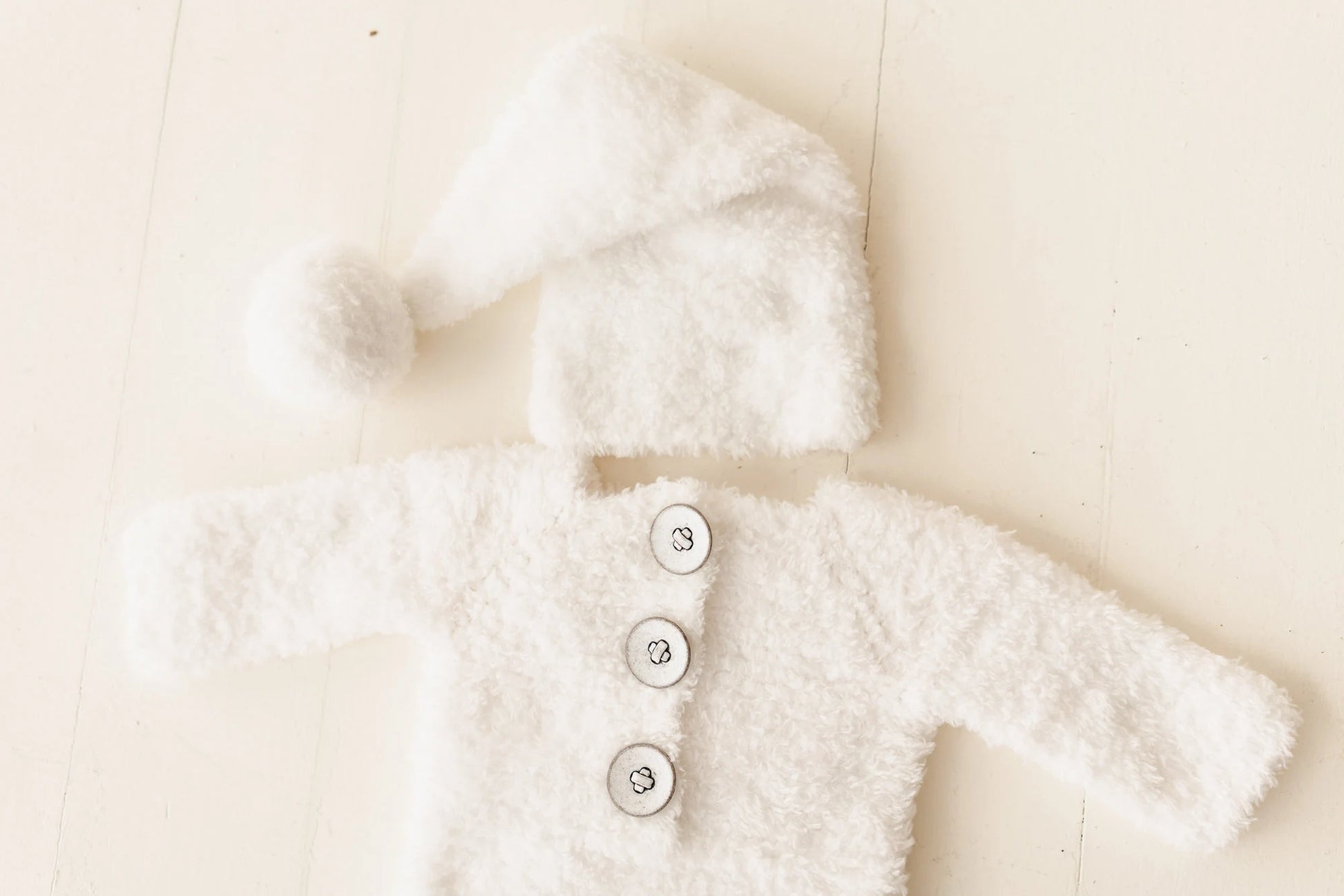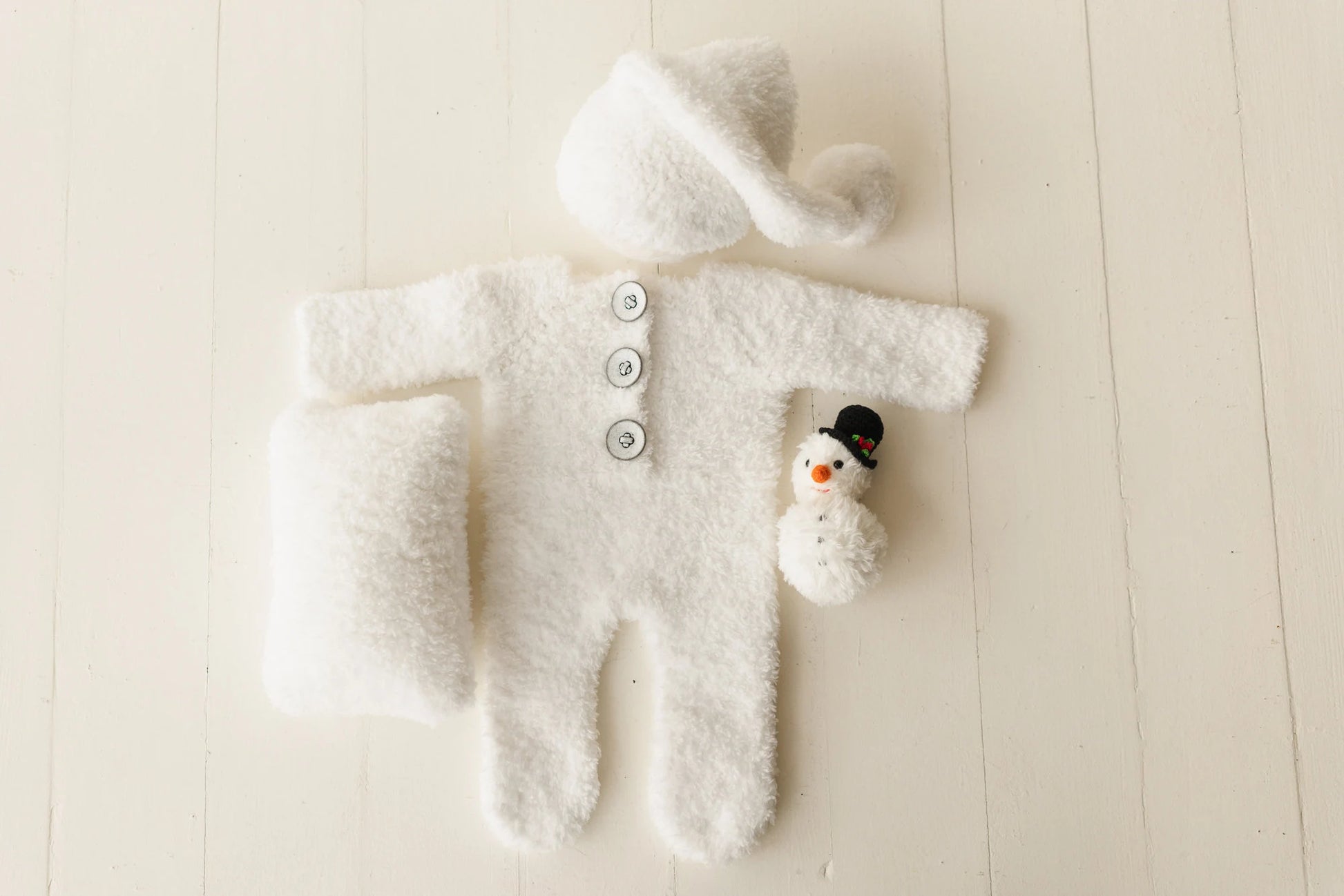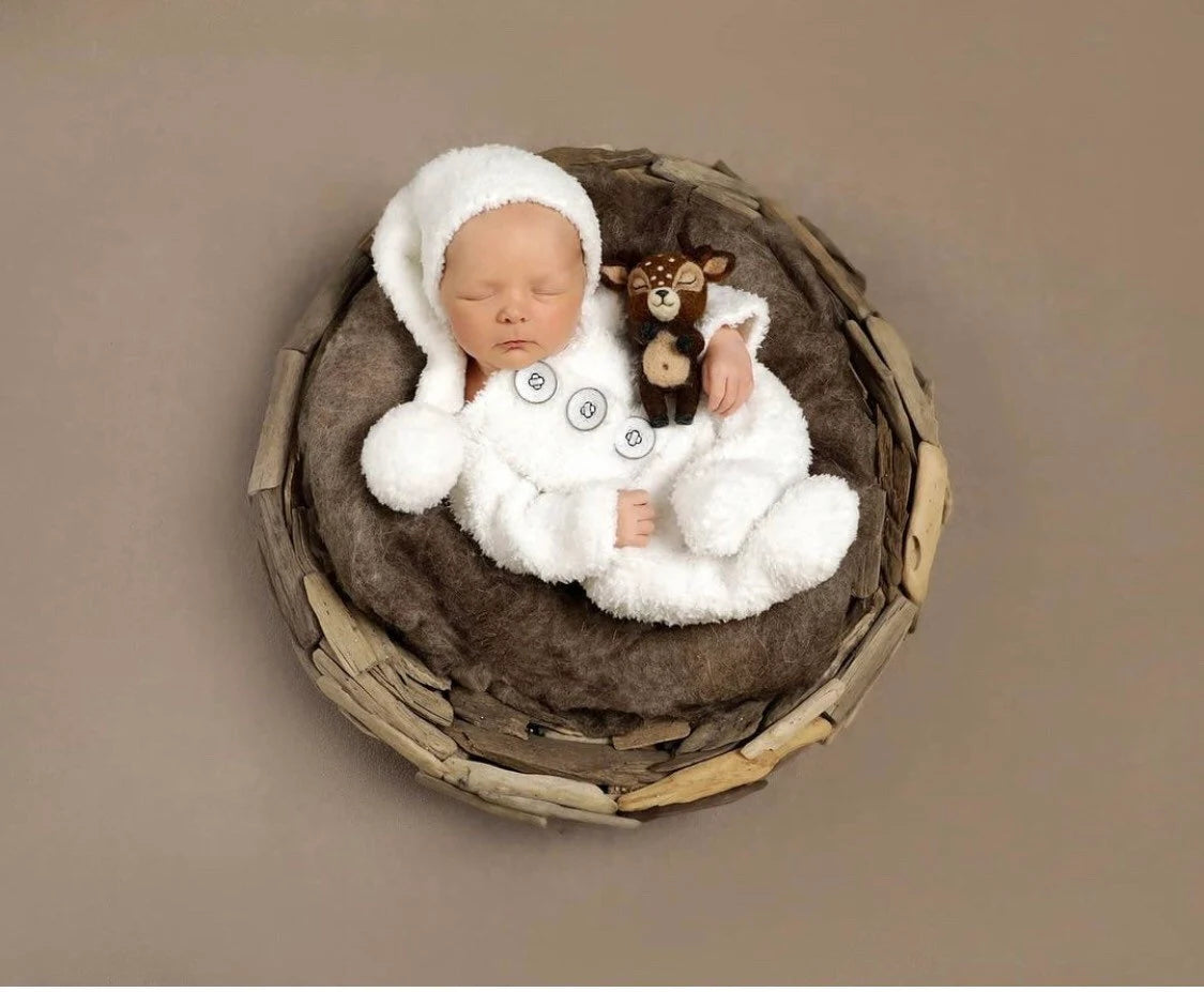 ニューボーン向けにつくられた雪だるまの衣装です。ふわふわの温かい風合いで、クリスマスフォトセッションはもちろんご自宅で家族と初めてのクリスマスを過ごすベビーにもぴったりです。柔らかなニットで手編みされ、細部にまで愛らしさを織り込んだこの雪だるま衣装には、さらに小さくかわいらしい雪だるまのぬいぐるみが付いています。