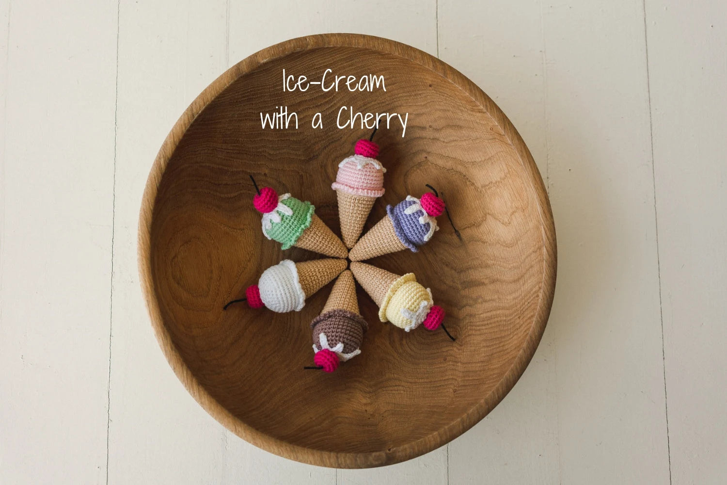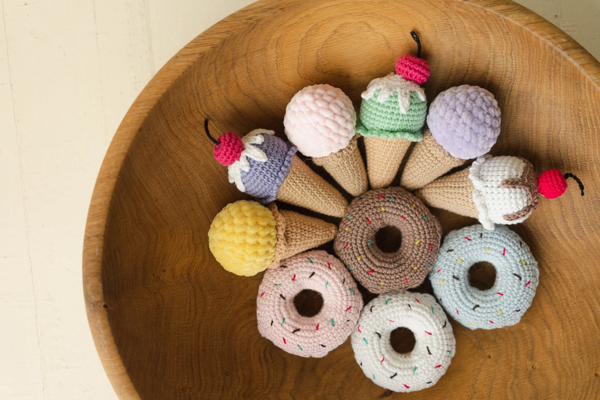 可愛らしい小さなスイーツのぬいぐるみはニューボーンフォト用プロップスとして最適です。1つ1つかぎ針編みで愛情をこめて手作りしています。